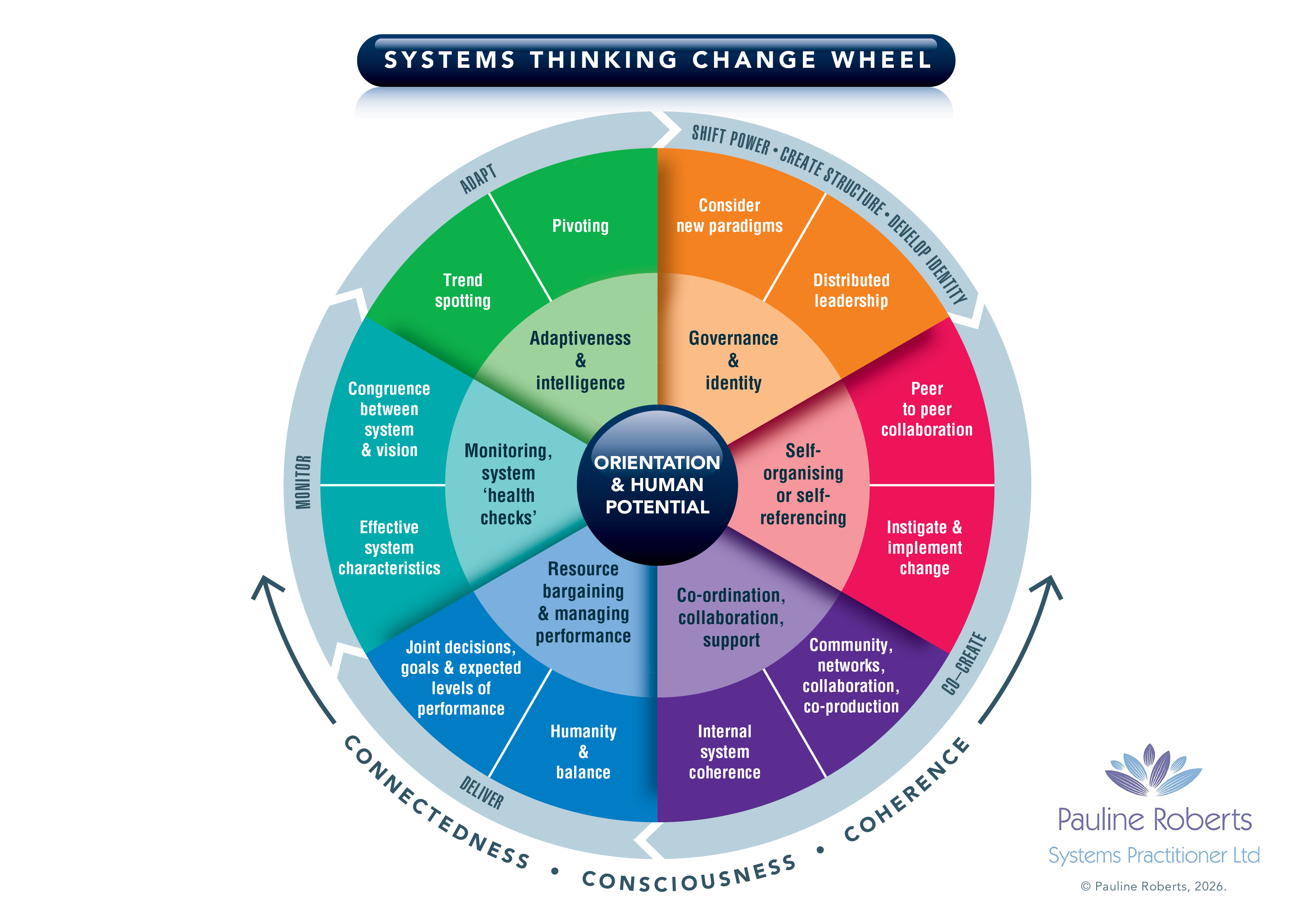 Below is V7 of the Systems Thinking Change Wheel, updated in 2026. This is the key infographic that supports the approach.